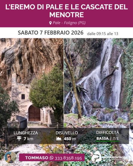 Proseguiremo poi fino a raggiungere le cascate del Menotre, formatesi proprio sotto lo sperone di roccia su cui poggia Pale, in un ambiente inaspettato e selvaggio.